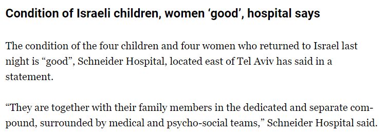 The condition of the four children and four women who returned to Israel last night, after Hamas released some of the hostages, is “good”, Schneider Hospital has said in a statement, Al Jazeera reports.