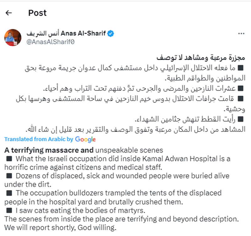 “A terrifying massacre and unspeakable scenes. What the Israeli occupation did inside Kamal Adwan Hospital is a horrific crime against citizens and medical staff,” Al-Sharif said in a post on X.
