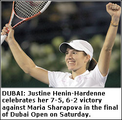 DUBAI, Feb 26: Justine Henin-Hardenne won her 25th career title on Saturday when she defeated Maria Sharapova 7-5 6-2 in the final of the Dubai Open.