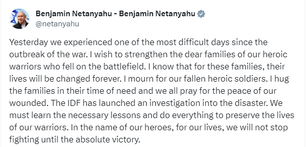 “I mourn for our fallen heroic soldiers. I hug the families in their time of need and we all pray for the peace of our wounded,” the Israeli president wrote on X.