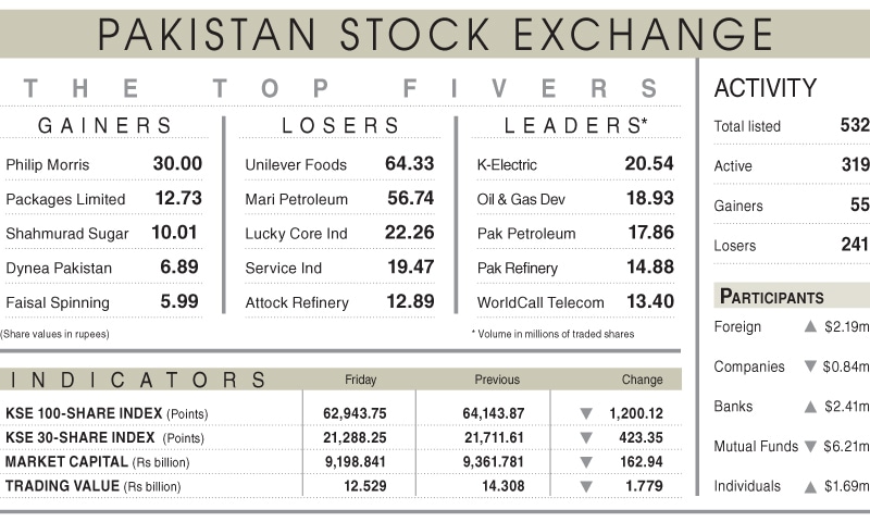As a result, the KSE-100 index closed at 62,943.75 points after losing 1,200.12 points or 1.87 per cent from the preceding session.