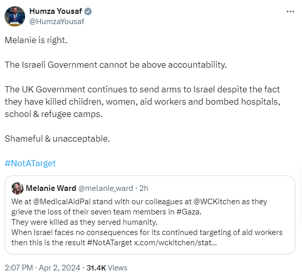 In a post on X, he said, “The UK government continues to send arms to Israel despite the fact they have killed children, women, aid workers and bombed hospitals, school and refugee camps.”