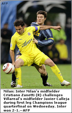 LONDON, March 30: Inter Milan grabbed a slender advantage over Villarreal with a 2-1 comeback victory while AC Milan came away from Olympique Lyon with a goalless draw in the second two quarterfinals of the Champions League on Wednesday.