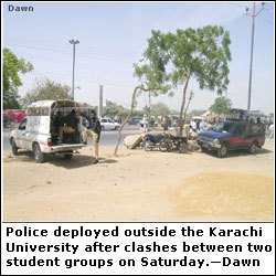 KARACHI, April 8: At least 15 students were injured on Saturday during clashes between activists of the All Pakistan Mohajir Students Organization (APMSO) and the Islami Jamiat Talaba (IJT), and baton charge by the Rangers, at the University of Karachi.