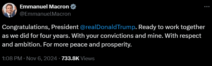 “Congratulations, President [Donald Trump],” wrote Macron on social media platform X.