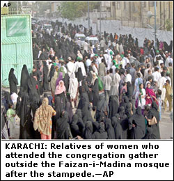 KARACHI, April 9: Twenty-one women and eight children died and over 50 others suffered injuries in a stampede inside a three-storey mosque where a large number of women had gathered on Sunday for a weekly congregation. Thousands of women usually attend the weekly congregation at Dawat-i-Islami’s Faizan-i-Madina mosque. But on Sunday, the attendance was even larger because of the approaching Eid Miladun Nabi, and two floors of the building were jam-packed.