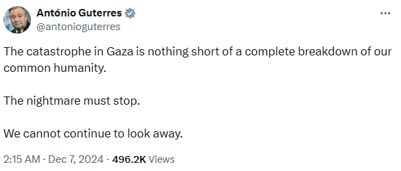 UN Secretary General António Guterres has said that the “catastrophe in Gaza is nothing short of a complete breakdown of our common humanity”.