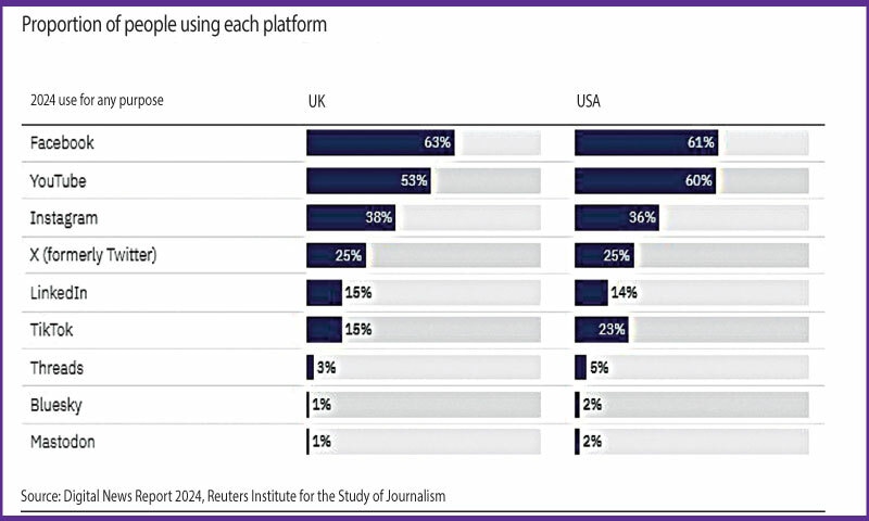 As for Bluesky, usage barely registered in our 2024 data. Usage for any purpose was two percent in the US and one percent in the UK. Facebook and YouTube are still the most widely used platforms in the UK and US, followed by Instagram.