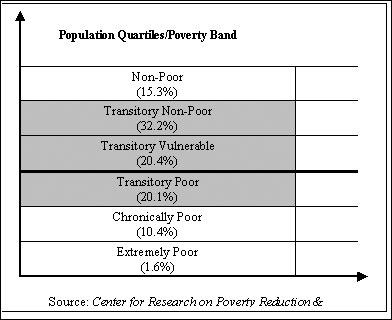 As a study by Centre for Research on Poverty Reduction and Income Distribution (CRPRID) suggests that poverty is characterized by large amounts of clustering around the poverty line. This suggests that there exists a high proportion of vulnerable population which is likely to move in and out of poverty as a result of changing economic conditions.