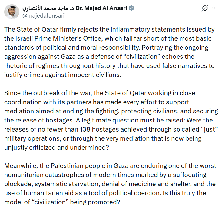“The State of Qatar firmly rejects the inflammatory statements issued by the Israeli Prime Minister’s Office, which fall far short of the most basic standards of political and moral responsibility,” Qatar’s foreign ministry spokesperson Majed Al-Ansari posted on X, according to Reuters.