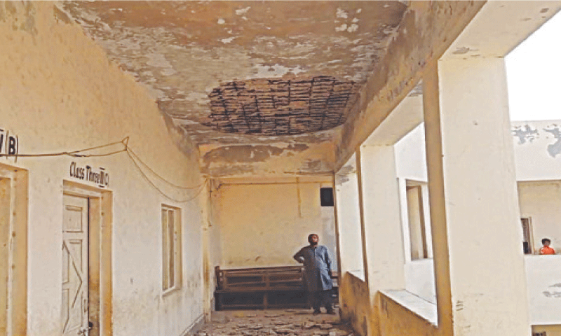 SUKKUR: A large plaster fell off the ceiling in the corridor of double-storied Aadarsh Government Primary School in Kandhkot town on Monday. Luckily no one was hurt as all students and teachers were attending assembly when the incident happened.