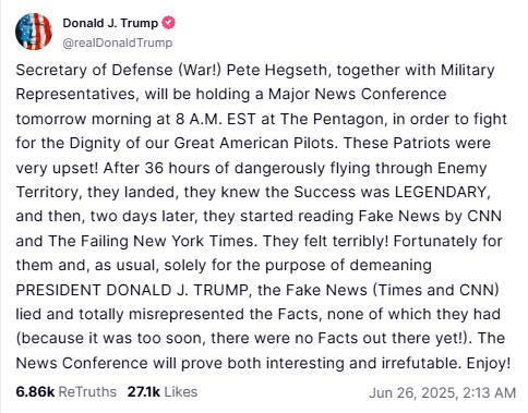 “Hegseth, together with Military Representatives, will be holding a Major News Conference tomorrow morning at 8am EST (5pm PKT) at The Pentagon, in order to fight for the Dignity of our Great American Pilots,” Trump said in a post on Truth Social on Wednesday.