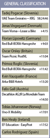 “I didn’t want to push too hard and then let him have me on a counter-attack. I kept my rhythm as much as I could,” said Pogacar who has been fighting off a cold this week. “He attacked many times but I just tried to hold his wheel.”