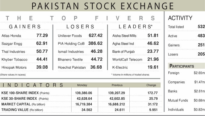 KARACHI: The Pakistan Stock Exchange (PSX) opened the week on a bullish note, briefly crossing the 140,000-point mark, but failed to sustain momentum due to profit-taking. The benchmark KSE-100 index closed marginally higher at 139,380.06, gaining 172.77 points or 0.12 per cent on Monday.