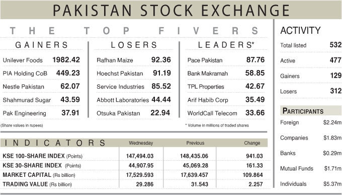 The benchmark KSE-100 index shed 941 points, closing below the 147,500 level. An early rebound was short-lived as selling pressure dominated the session, with risk aversion prevailing among investors.