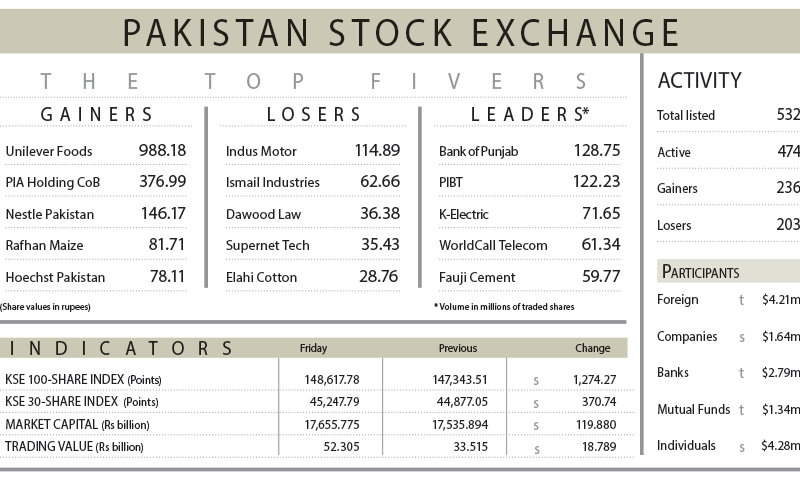 Trading activity also picked up, with volumes rising 43.47pc to 1.34bn shares, while the traded value jumped 56.06pc to Rs52.3bn. Bank of Punjab topped the volume chart with 1.28bn shares.