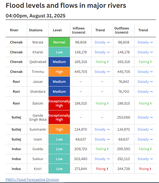 Balloki recorded “falling” outflows of 186,515 cusecs, while Ganda Singh Wala logged 253,068 cusecs of water gushing through. “High” flood levels were recorded at Chiniot and Trimmu on the Chenab River, as well as at Sulemanki on Sutlej.
