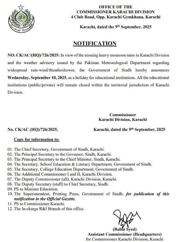 “All the educational institutions (public/private) will remain closed within the territorial jurisdiction of Karachi Division,” said a notification by the Karachi commissioner, dated Sept 9.