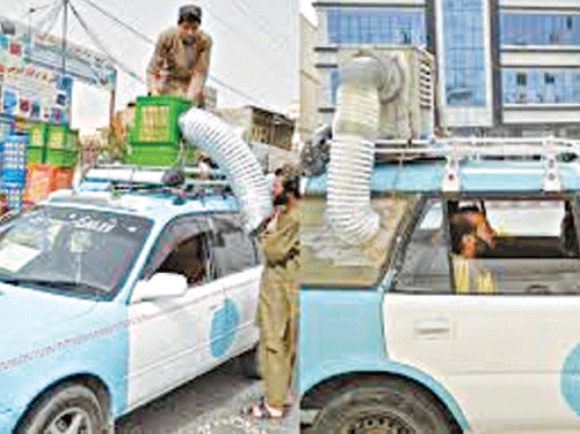 In Kandahar, Afghanistan, many taxi drivers rely on handmade roof-mounted cooling boxes instead of car air conditioners, which often break down and are costly to repair.