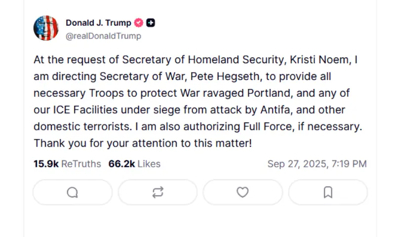 “At the request of Secretary of Homeland Security, Kristi Noem, I am directing Secretary of War, Pete Hegseth, to provide all necessary Troops to protect War ravaged Portland, and any of our ICE Facilities under siege from attack by Antifa, and other domestic terrorists,” Trump wrote on his Truth Social platform.