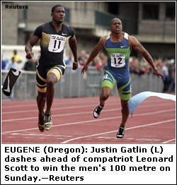 EUGENE (Oregon), May 29: Olympic and world champion Justin Gatlin clocked 9.88 seconds to outperform joint world record holder Asafa Powell in separate 100 metres races at the Prefontaine Classic on Sunday.