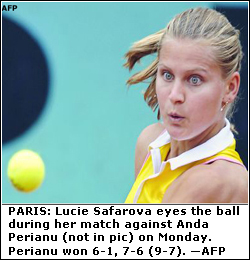 Women’s: Patty Schnyder (SUI x7) bt Michaella Krajicek (NED) 6-1, 6-2; Francesca Schiavone (ITA x9) bt Alona Bondarenko (UKR) 6-3, 6-4; Karolina Sprem (CRO) bt Elena Likhovtseva (RUS x18) 6-1, 6-1; Vera Dushevina (RUS) bt Anastassia Rodionova (RUS) 6-3, 6-2; Jelena Jankovic (SEM) bt Laura Pous Tio (ESP) 7-5, 6-4; Anda Perianu (ROM) bt Lucie Safarova (CZE) 6-1, 7-6 (9-7); Jarmila Gajdosova (SVK) bt Stephanie Cohen-Aloro (FRA) 6-2, 5-7, 6-3; Catalina Castano (COL) bt Aiko Nakamura (JPN) 4-6, 6-3, 6-1; Hana Sromova (CZE) bt Roberta Vinci (ITA) 6-1, 7-5; Aravane Rezai (FRA) bt Alberta Brianti (ITA) 6-4, 7-6 (7/1); Sofia Arvidsson (SWE x29) bt Maria Vento-Kabchi (VEN) 6-4, 6-2; Katarina Srebotnik (SLO x24) bt Anna Smashnova (ISR) 6-4, 4-6, 6-2; Kim Clijsters (BEL x2) bt Virginie Razzano (FRA) 6-0, 7-6 (7/4).—Agencies