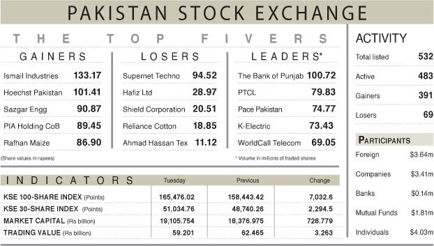 KARACHI: The Pakistan Stock Exchange (PSX) staged a strong recovery on Tuesday, as the benchmark KSE-100 index posted its second-highest single-session gain in history, driven by easing border tensions with Afghanistan and improving investor sentiment. The index surged by 7,032.60 points, or 4.44pc, to close at 165,476.02. This gain marks the second-largest absolute increase in a day, with the top three surges all occurring within the past six months, signalling sustained optimism among investors.