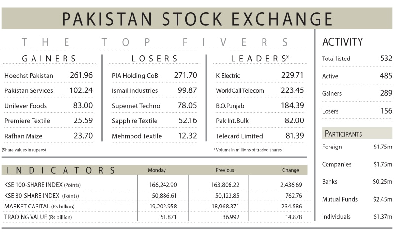 KARACHI: Positive developments on economic and geopolitical fronts on Monday fuelled a bullish run at the Pakistan Stock Exchange (PSX) which boosted investors sentiments propelling the benchmark KSE 100 index above 166,000-point barrier.