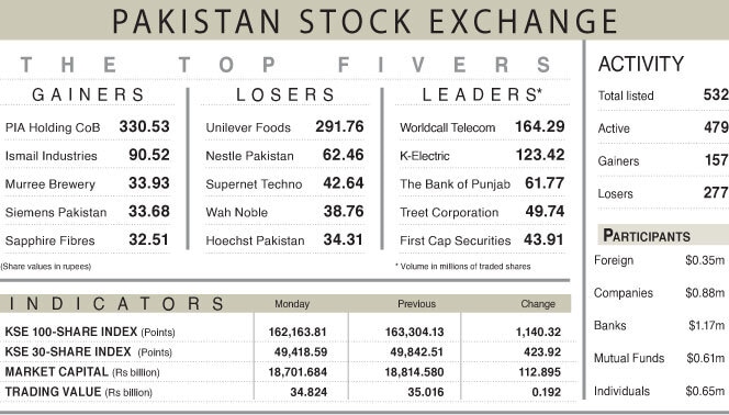 Market activity weakened, with trading volume dipping 3.31 per cent to one billion shares, while the traded value fell to Rs34.8 billion from the previous session. WorldCall Telecom led the volume chart with 164.2 million shares traded.