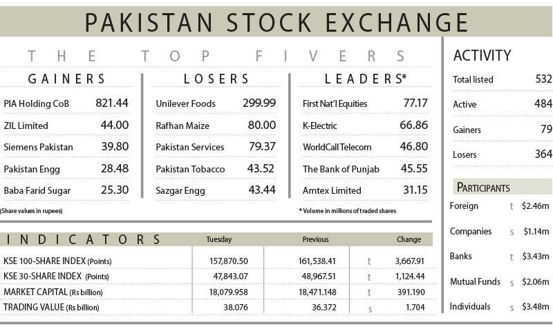 The KSE-100 index closed at 157,870.50 points, down by 3,667.90 points, or 2.27 per cent. The session saw significant volatility, with the index fluctuating between a high of 161,516 and a low of 157,765 points, according to Topline Securities Ltd.