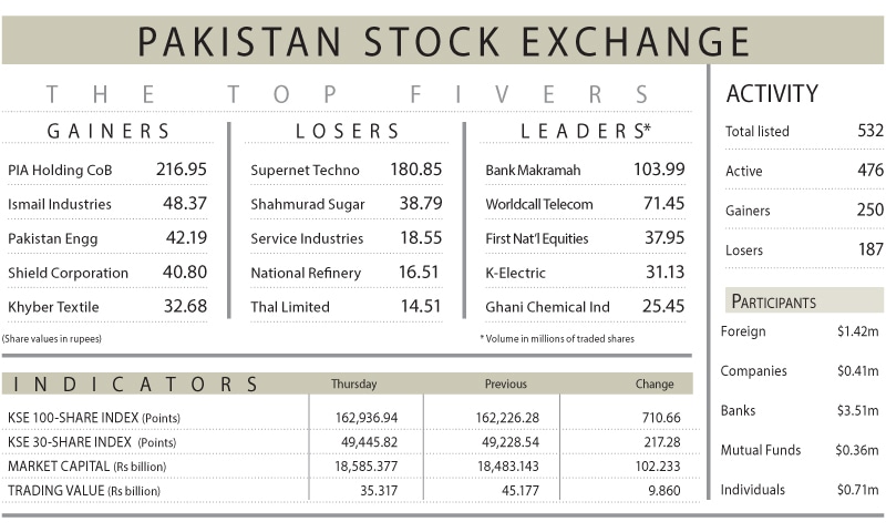KARACHI: The Pakistan Stock Exchange (PSX) on Thursday turned in yet another bullish performance as investors continued building positions at attractive levels, pushing the benchmark index close to the 164,000-point barrier intraday.