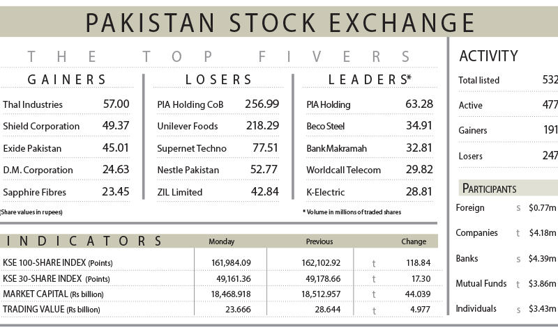 Nevertheless, selective buying in the latter part of the session helped stabilise the benchmark at 161,984, after recording an intraday high of 162,385 and a low of 161,241. The benchmark KSE 100 index eventually settled at 161,984.09 points, down 118.84 points or 0.07 per cent.