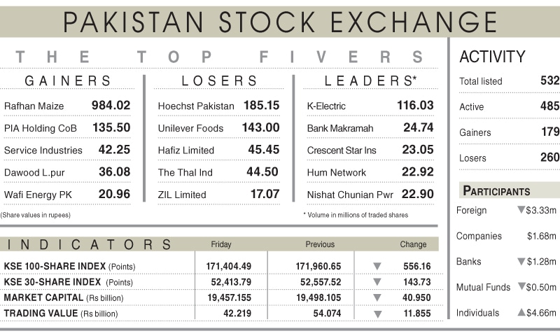 The benchmark KSE-100 index dropped by 556.16 points, or 0.32 per cent, ending at 171,404.49. The market’s performance reflected a battle between bulls and bears, with the latter prevailing as the session progressed.
