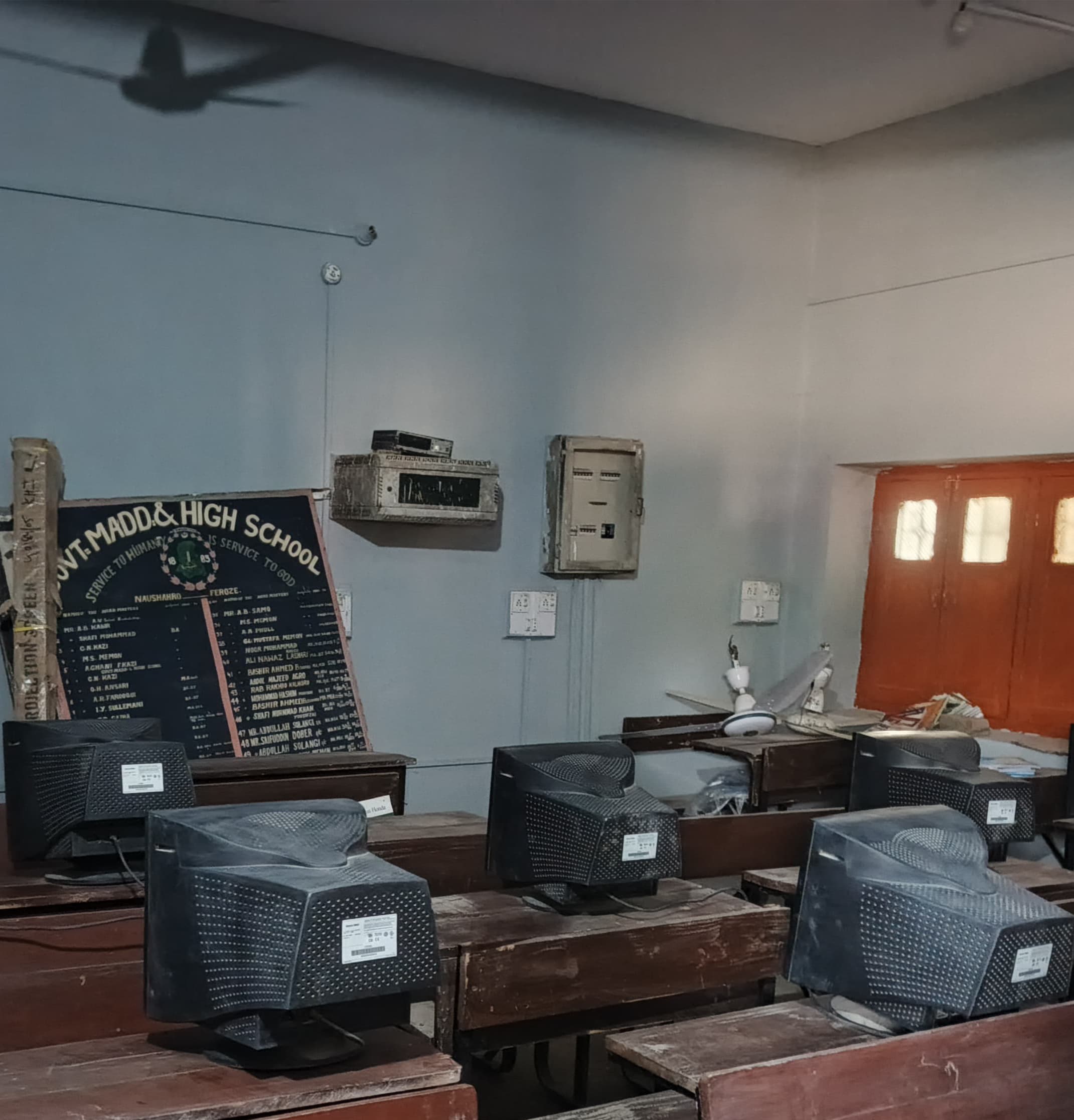 The lab is practically non-functional. Almost all computers are outdated, dead, or missing from the original inventory. The monitors do not switch on, keyboards and CPUs are unusable, and even the printers belong to a generation now obsolete. The school is forced to rely on a single working laptop and one projector, leaving hundreds of students without any meaningful exposure at all to ICT.