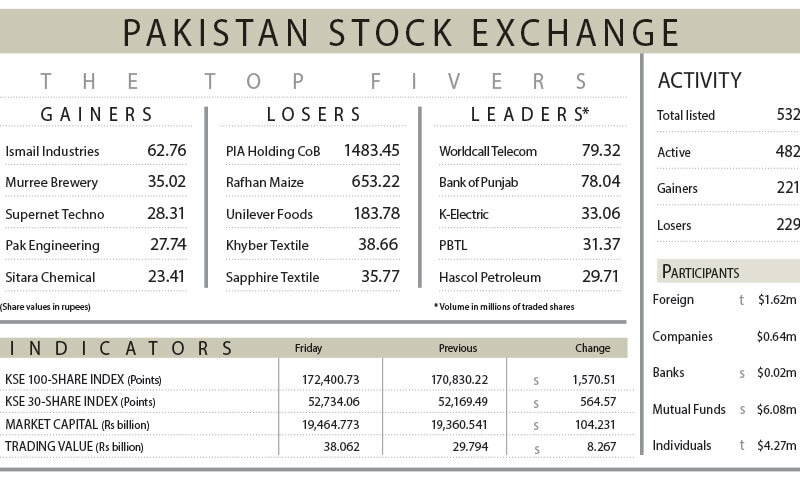 KARACHI: The Pakistan Stock Exchange (PSX) surged to a record high on Friday, with the benchmark KSE 100 index breaking the 172,000-point barrier for the first time after subdued performances in early sessions of the short-week.