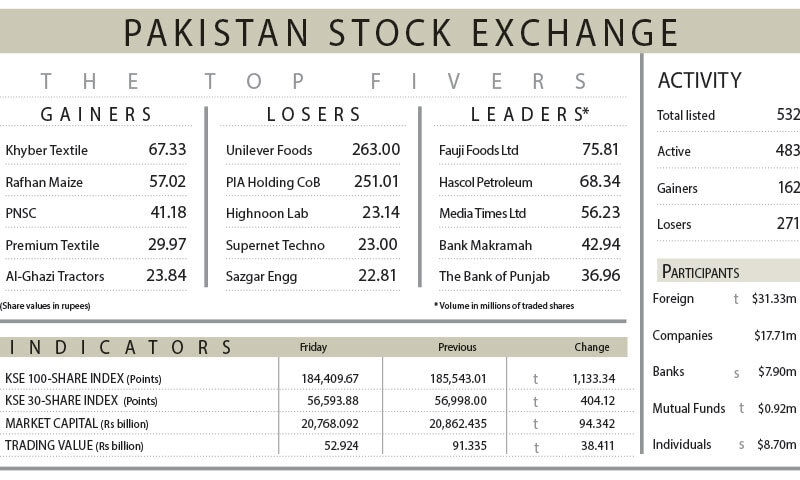 KARACHI: The Pakistan Stock Exchange (PSX) remained under selling pressure as investors continued taking profits at inflated levels for the second straight session on Friday, dragging the benchmark KSE-100 index below 185,000 points, closing the weekend session on a bearish note after a record run.