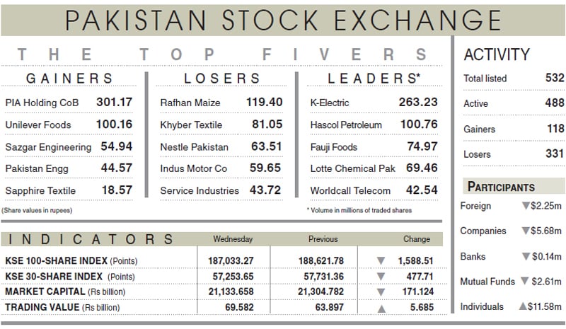 KARACHI: Having scaled a new peak above the 188,000-point barrier overnight, the bears snapped the record-setting spell at the Pakistan Stock Exchange (PSX) on Wednesday as investors indulged in profit-taking, forcing the benchmark KSE-100 index to close in the red amid extreme volatility in the absence of any positive triggers.
