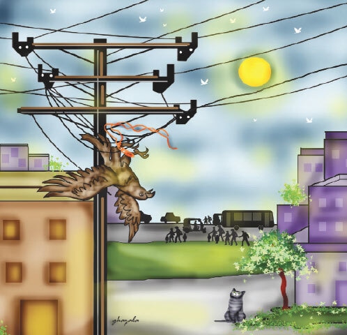 Everything around me was upside down, for I was hanging, tangled in a metal wire beside an electric pole. I had fluttered my wings with all my strength to free myself, but all in vain.