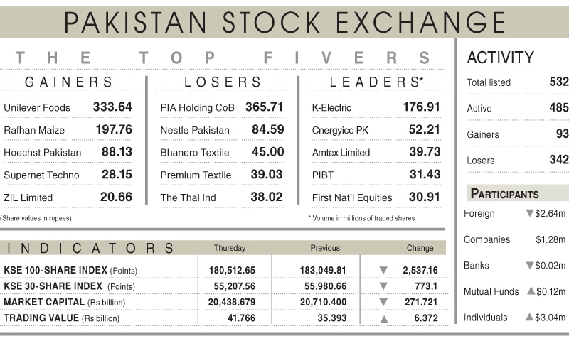Market participation remained higher than the previous session, with trading volume rising almost 19pc to 874m shares and traded value increasing 18pc to Rs41.7bn, indicating investors rushed to exit amid persistent volatility.