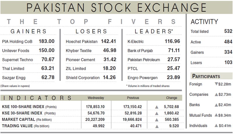 Despite a massive rally, market participation weakened, with trading volume dipping 2.56pc to 697.6 million. However, the traded value rose 23.52pc to Rs49.9 billion. K-Electric continued to dominate the volume chart, with 116 million shares traded.