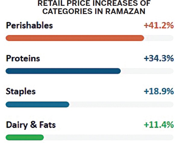 It is estimated that, over the last five cycles of Ramazan, the price of the most basic basket of food, as tracked by the Sensitive Price Index (SPI), has increased by an average of 27 percent every year. This is the spike that is in addition to overall inflation at play. Before the start of the holy month, as demand picks up, prices of food items start picking up, with perishable items leading the charge.