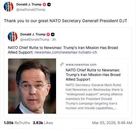 “Thank you to our great Nato Secretary General!” he said in a post on Truth Social.