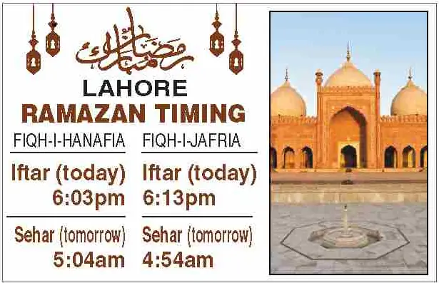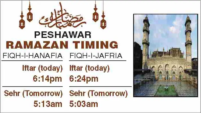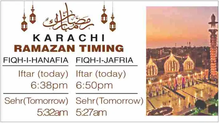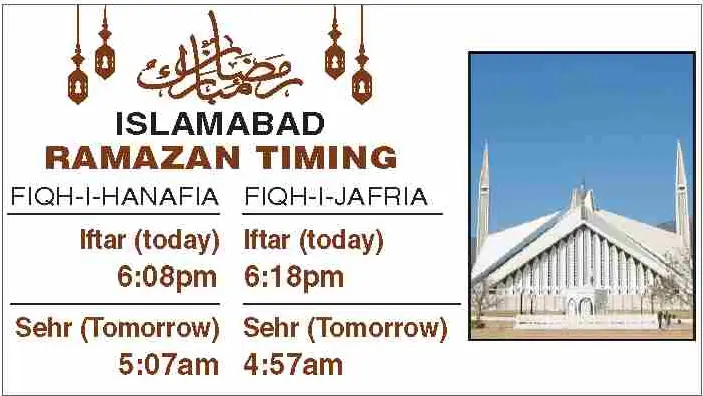 Times for today’s Iftar (Ramazan 15) and tomorrow’s Sehri (Ramazan 16) for the federal and provincial capitals are listed below: