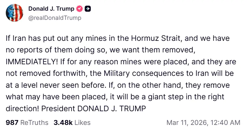 “If for any reason mines were placed, and they are not removed forthwith, the military consequences to Iran will be at a level never seen before,” Trump said in a post on his Truth Social platform.