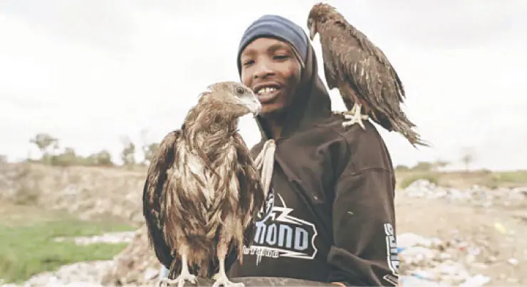 Rogers Olu Maguta, a homeless man living in Nairobi, has become known as the “Nairobi Birdman” for caring for injured birds of prey. He spends his days rescuing and feeding wounded birds, often carrying them on his head and shoulders until they recover.