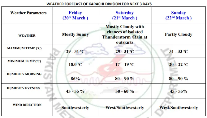 However, in a three-day weather outlook for Karachi, the PMD said the weather was expected to be “mostly cloudy with chances of isolated thunderstorm/rain at outskirts”.
