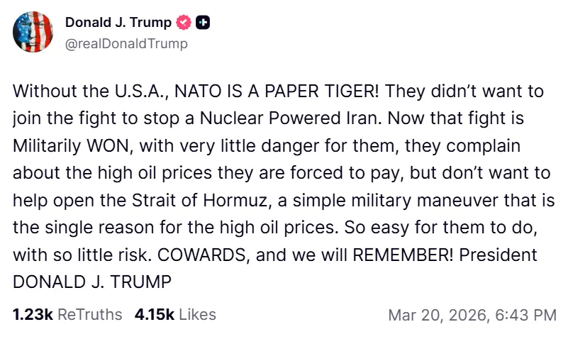 The US president has lashed out at fellow members of the Nato military alliance, saying they are “cowards” for failing to join the Iran war or deploy forces to help secure the Strait of Hormuz, Al Jazeera reports.
