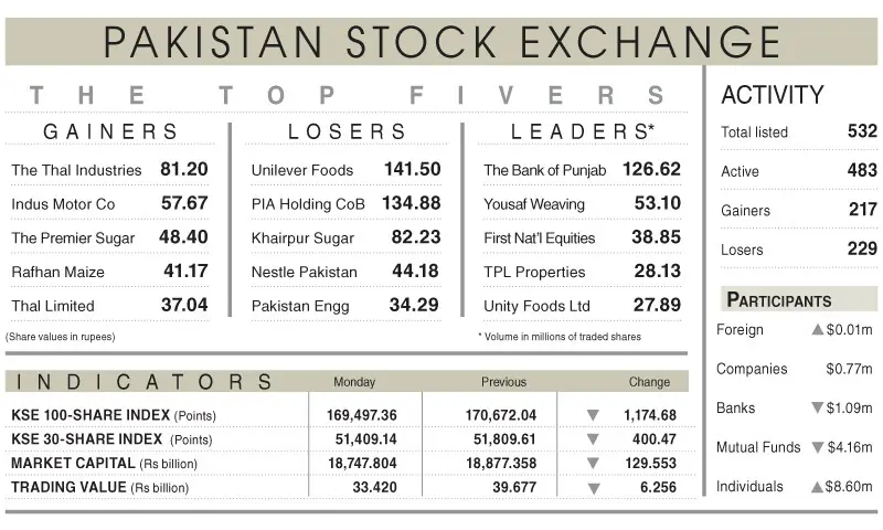 Investor participation weakened sharply, with total trading volume plunging 34.55pc to 780 million shares and traded value dipping 15.76pc to Rs33.3 billion. Bank of Punjab topped the volume chart with 126.6 million shares traded.