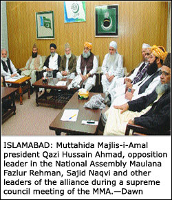 The heads of all the parties in the alliance attended the four-hour meeting of the supreme council. Sahibzada Ans Noorani, son of former MMA president late Maulana Shah Ahmed Noorani who has recently been elected JUP president, was among the participants.