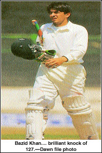 Driving with authority, especially on the on-side, Bazid stroked 17 fours during his stay of four hours and 11 minutes and negotiated exactly 200 deliveries. His dismissal at 309 came when he tried a wild swish to an almost wide short-pitched delivery from medium-pacer Azhar Shafiq but only succeeded in getting a bottom edge to wicket-keeper Aamir Iqbal.